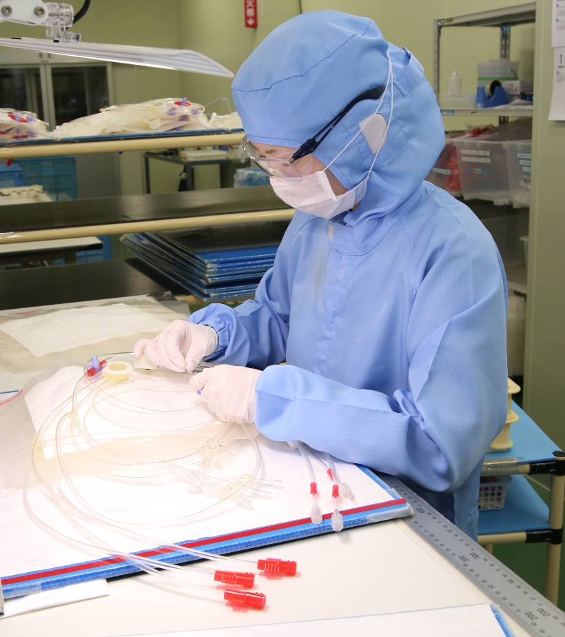 • クリーンな作業環境にて、チューブ部材の接着・組立作業を行っています。